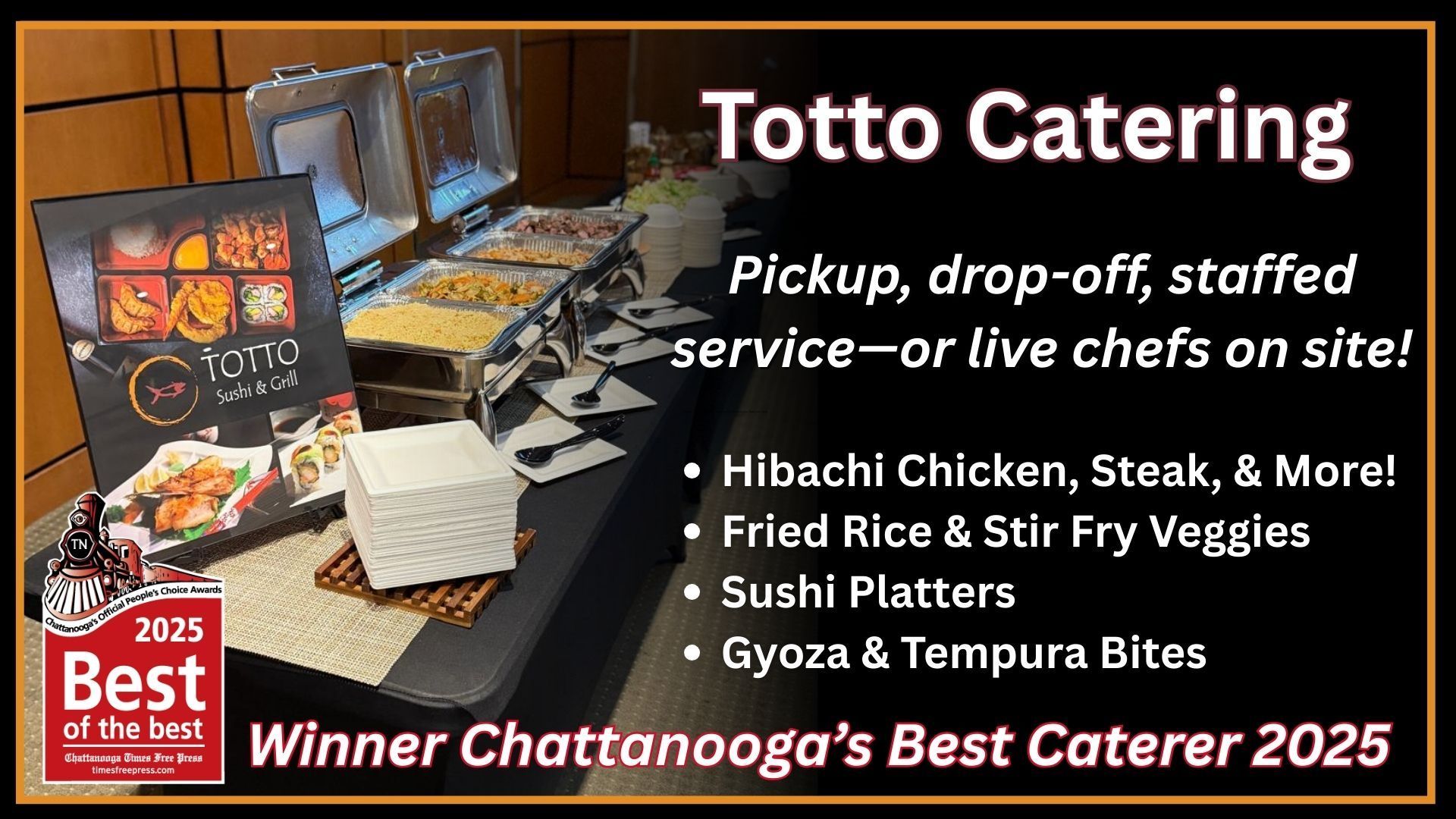 Totto Sushi & Grill has proudly served the Chattanooga Northshore community for over 12 years as a family-owned mom-and-pop restaurant. We offer an extensive menu with 15+ signature sushi rolls, fresh sashimi, succulent nigiri, sizzling hibachi, and flavorful bento boxes, all made with the finest ingredients.